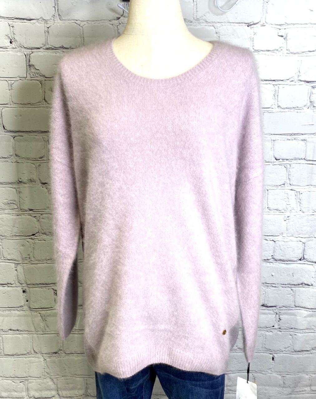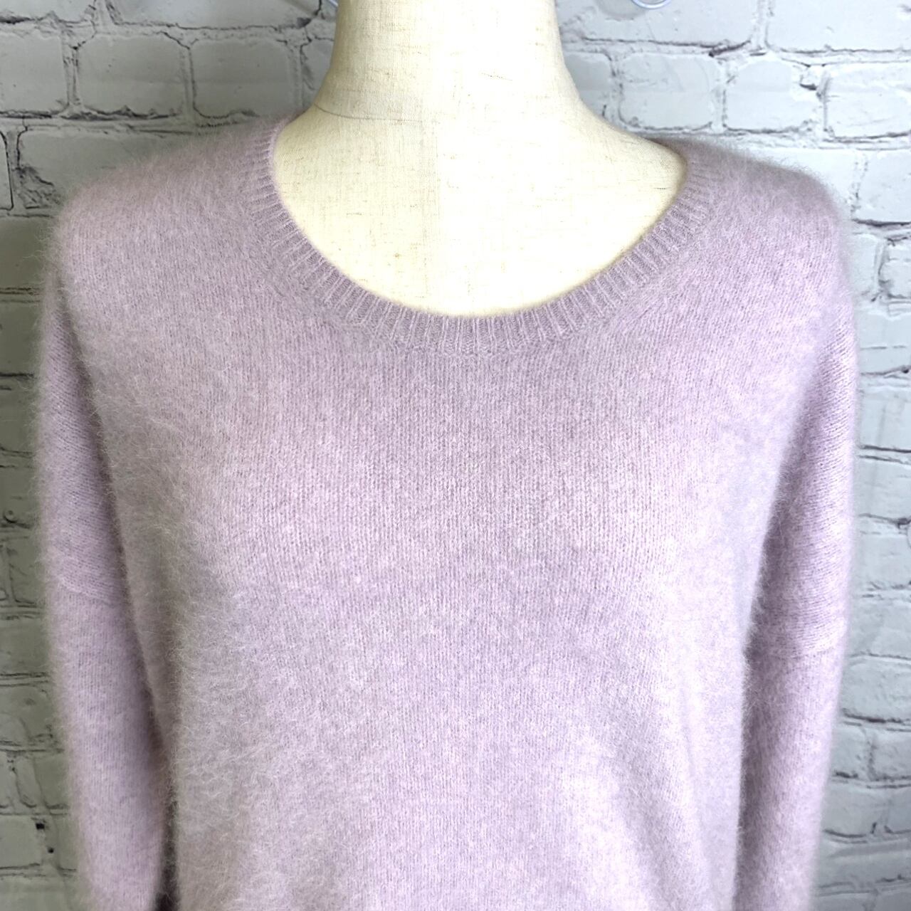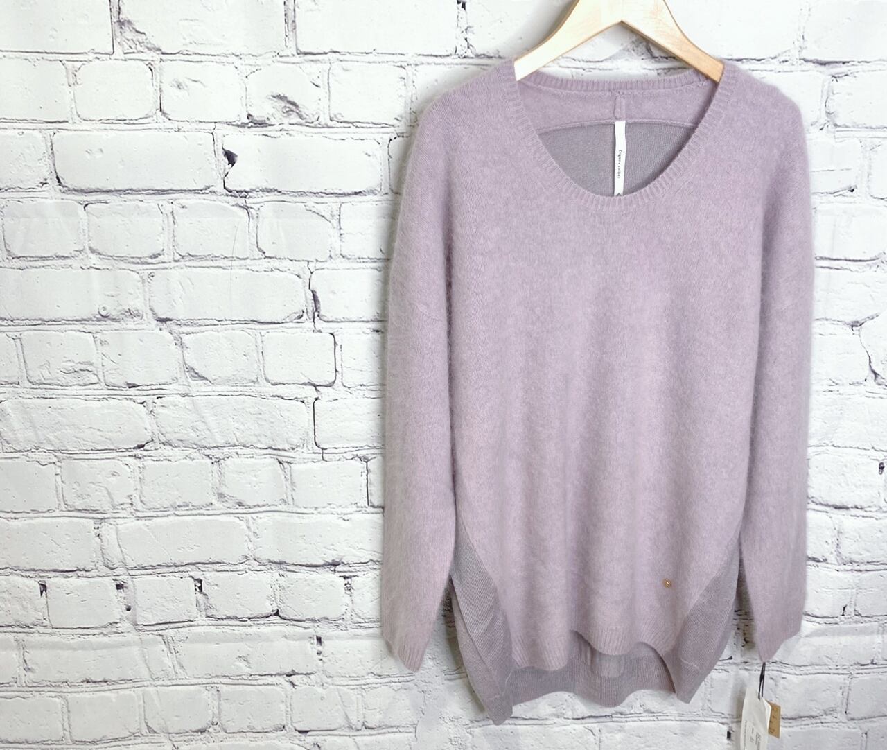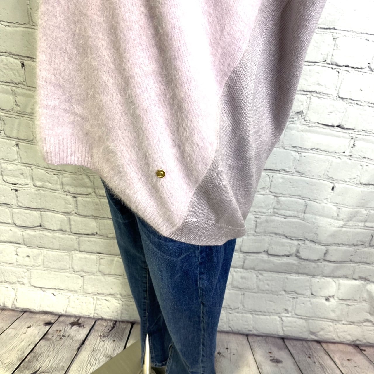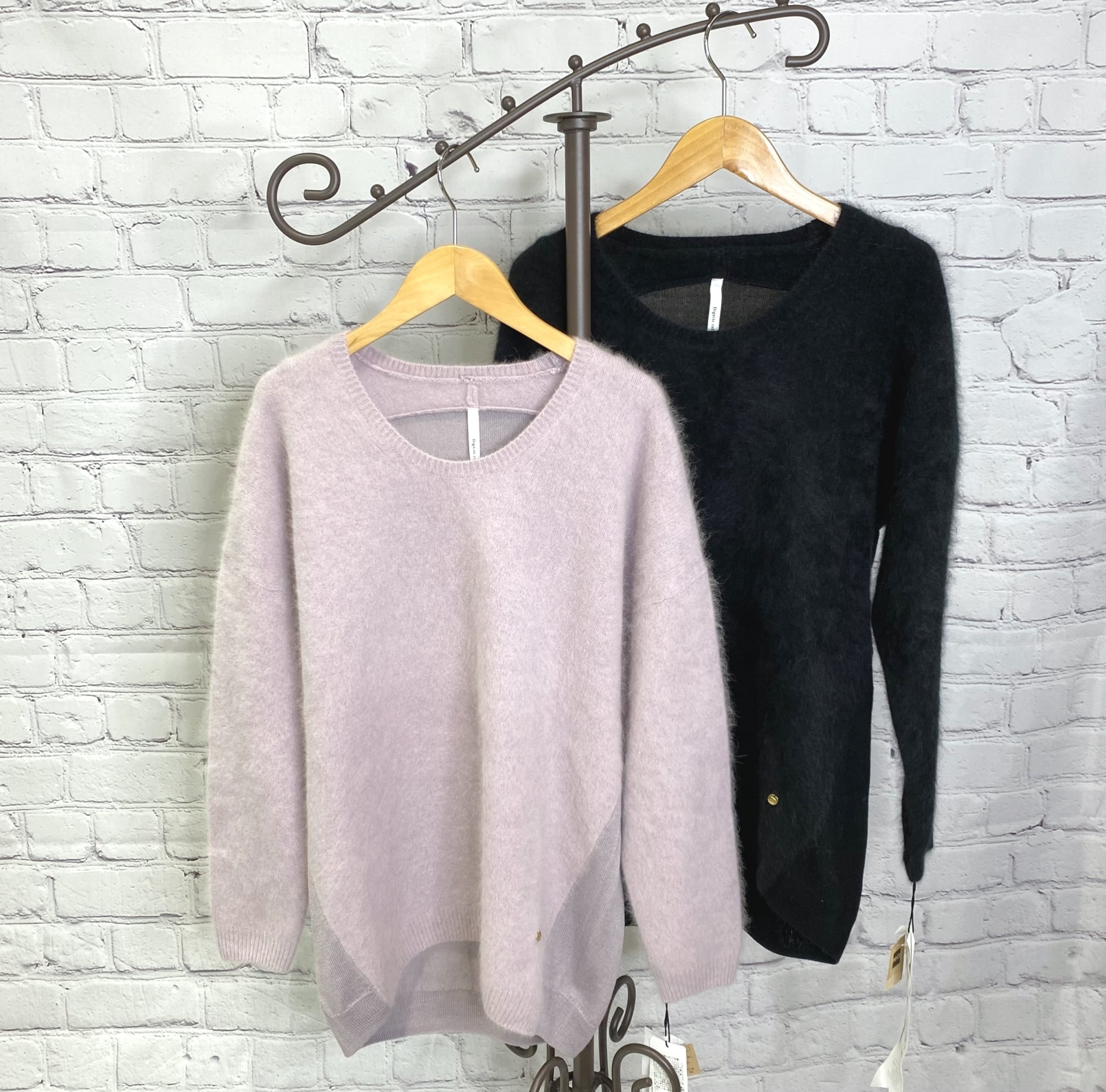 ふんわり優しげなニットプルオーバーです。軽くて暖かく後ろのきりかえがすっきりみせてくれます。ヒップをカバーしてくれるやや長めの着丈です。ボトムス選ばずコーデしやすくておすすめです。