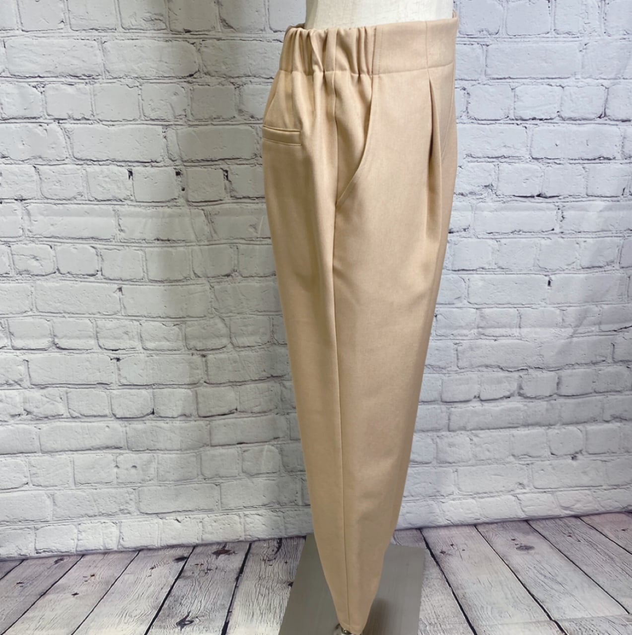 ウールのような風合いを醸し出し上品なイメージを演出できる少し緩めのテーパードパンツです。ウエスト後ゴムで楽ちん!両サイドポケットあり。脚長効果ありで美脚シルエットのパンツです。同素材のジャケット(83009)と、セットアップ出来ます。日本製。