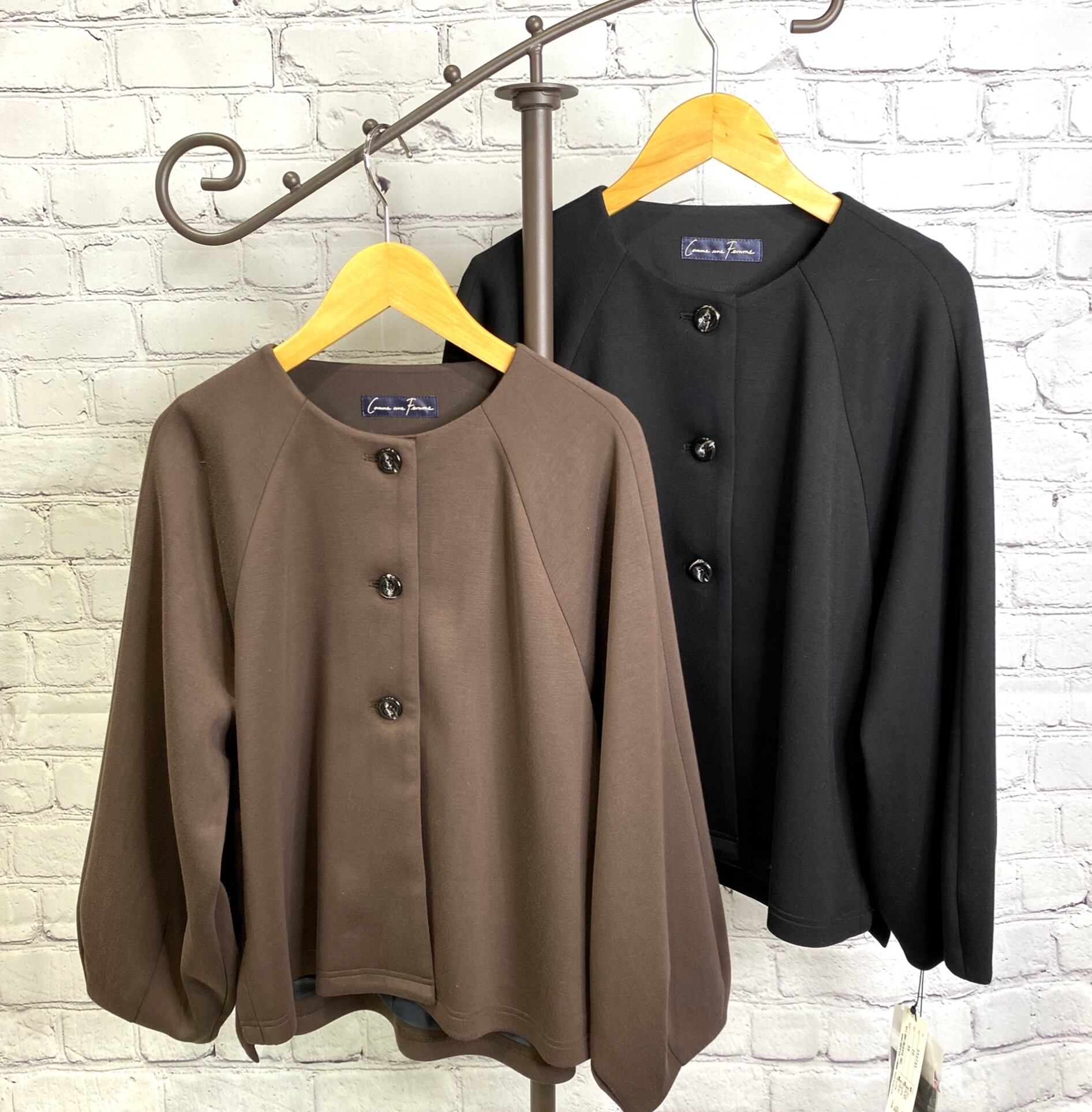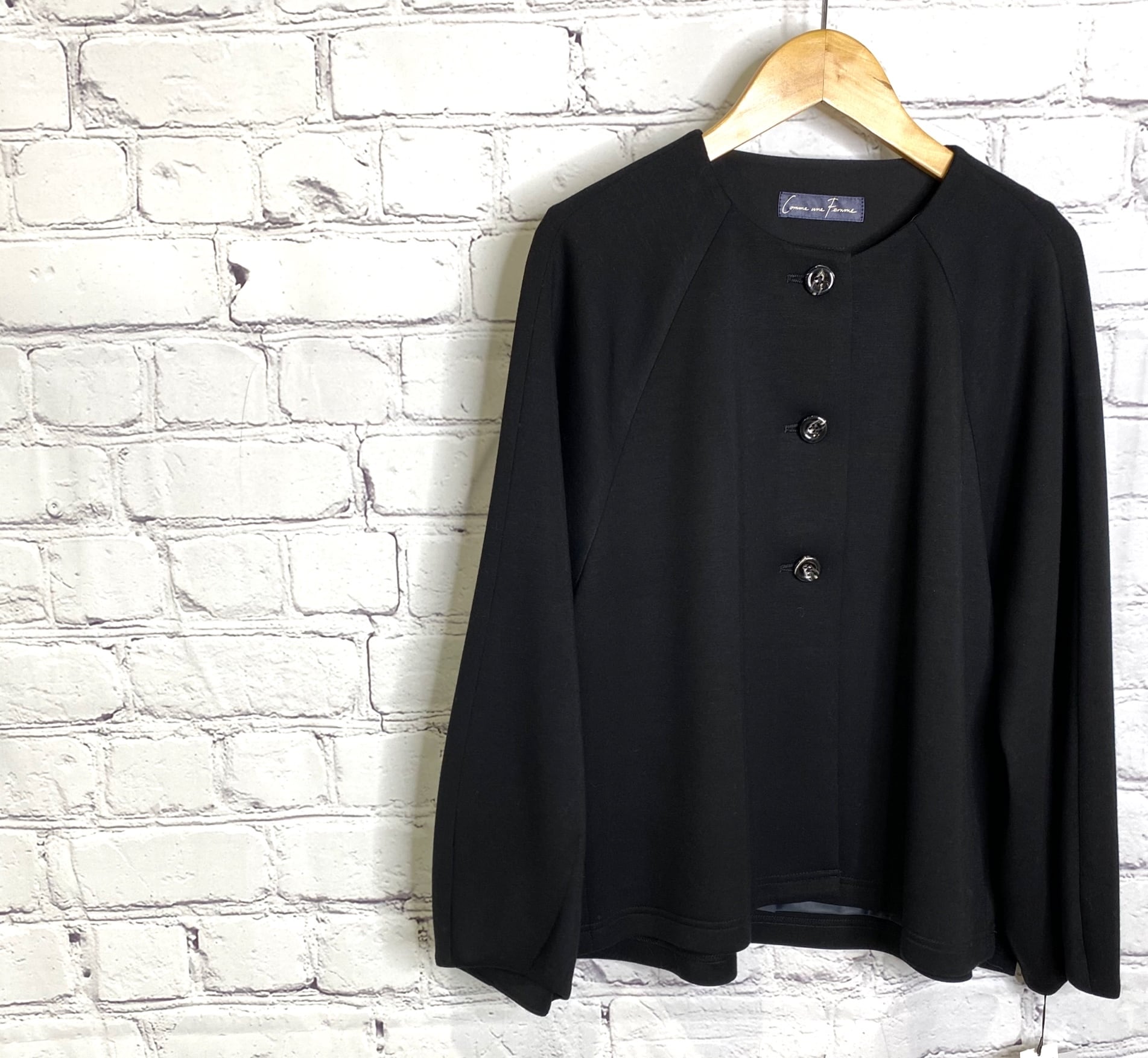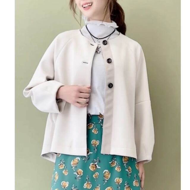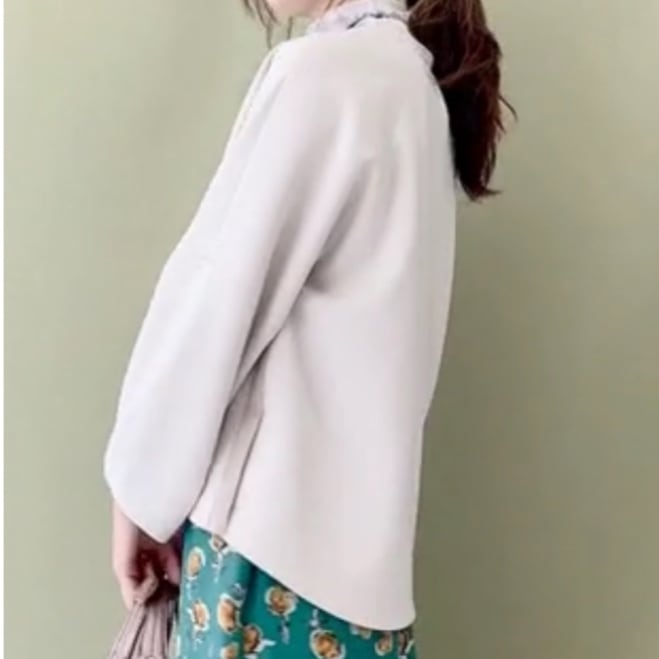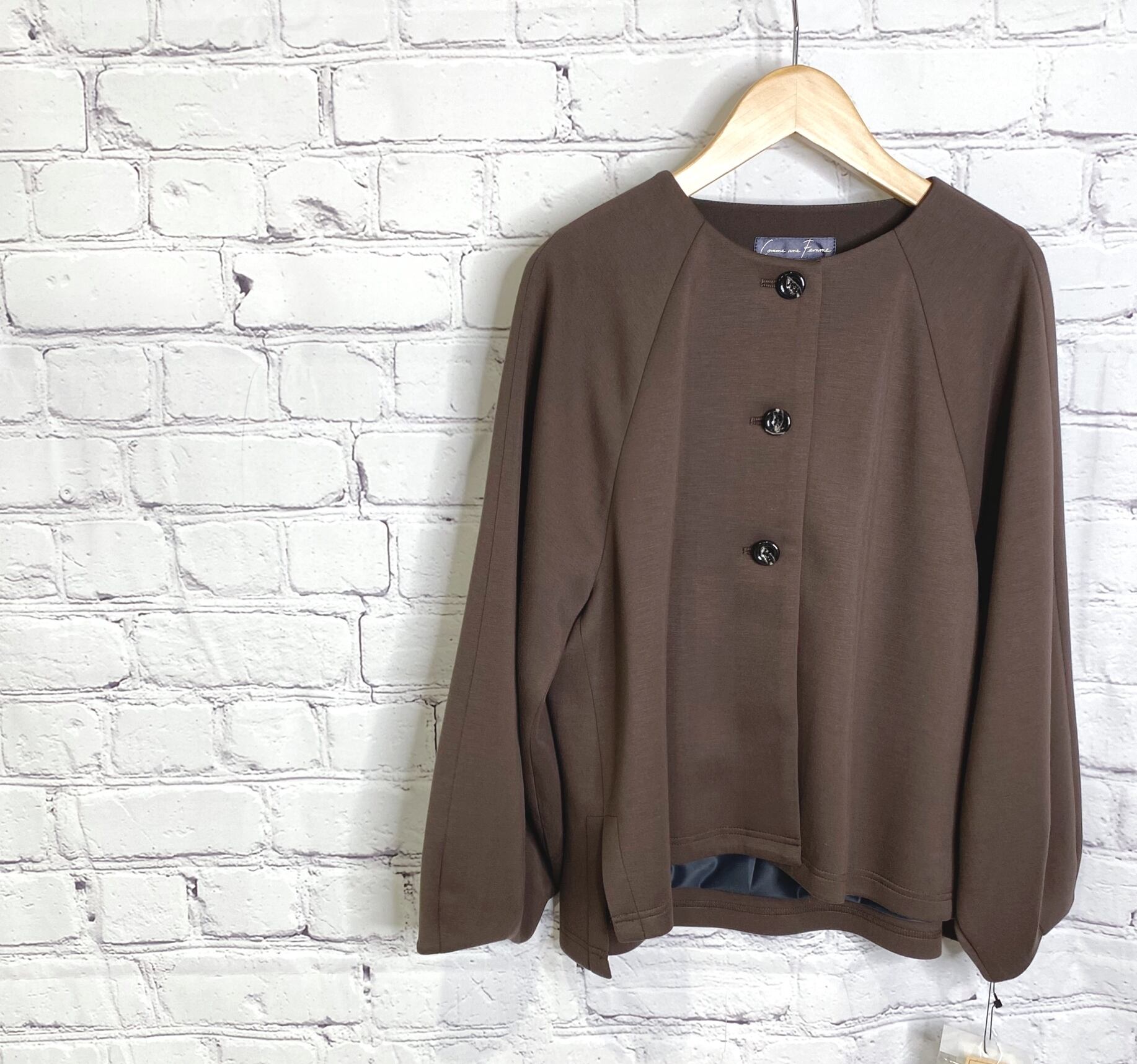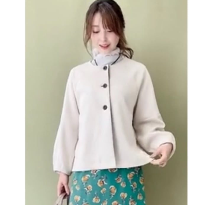 フロントの上から3ボタンがポイントのシンプルジャケットです。 ノーカラーなので人気のボトルネックのトップスを合わせたり首元のおしゃれも楽しめます。お袖がゆるめでシルエットが大人かわいい一枚です。