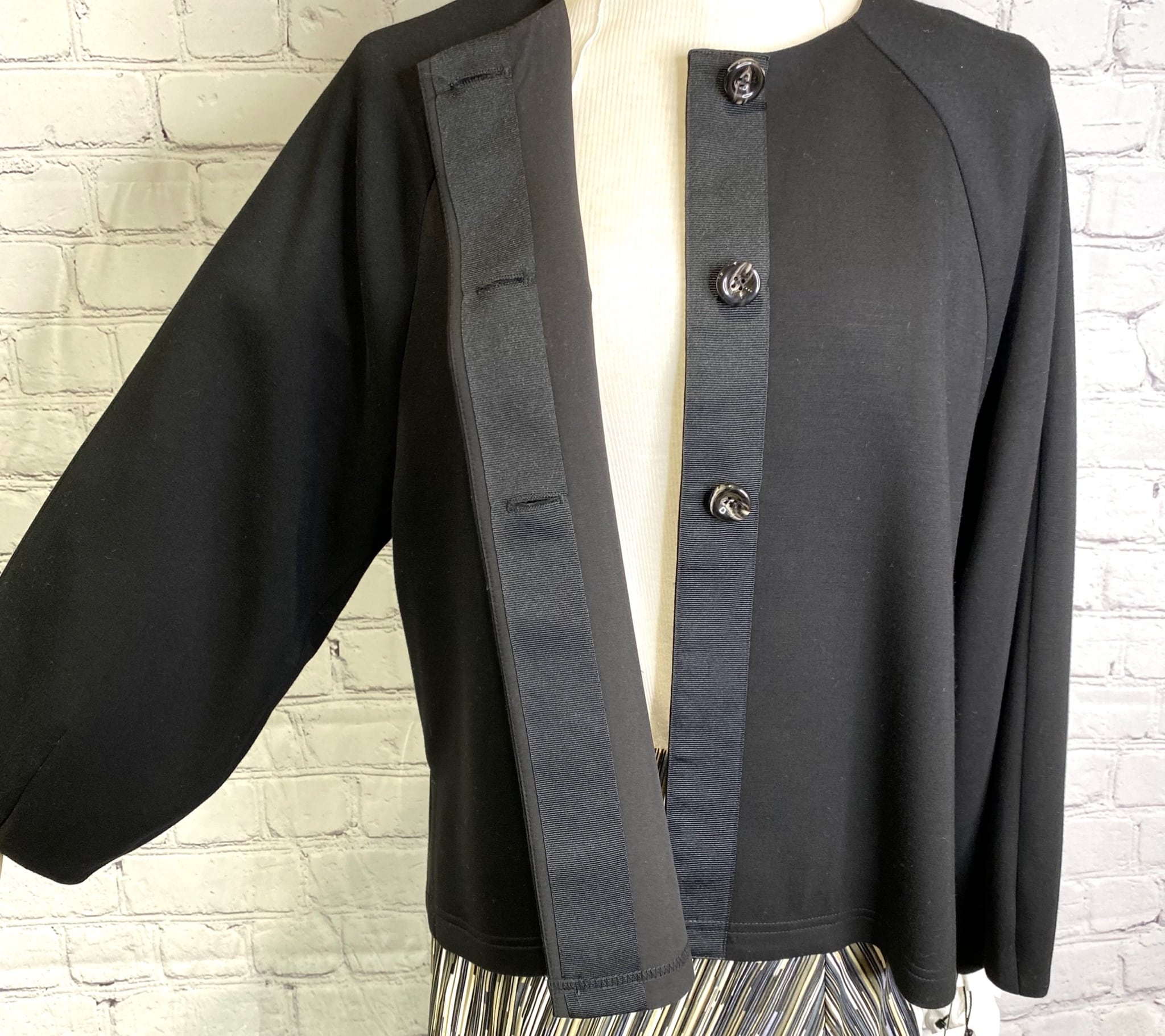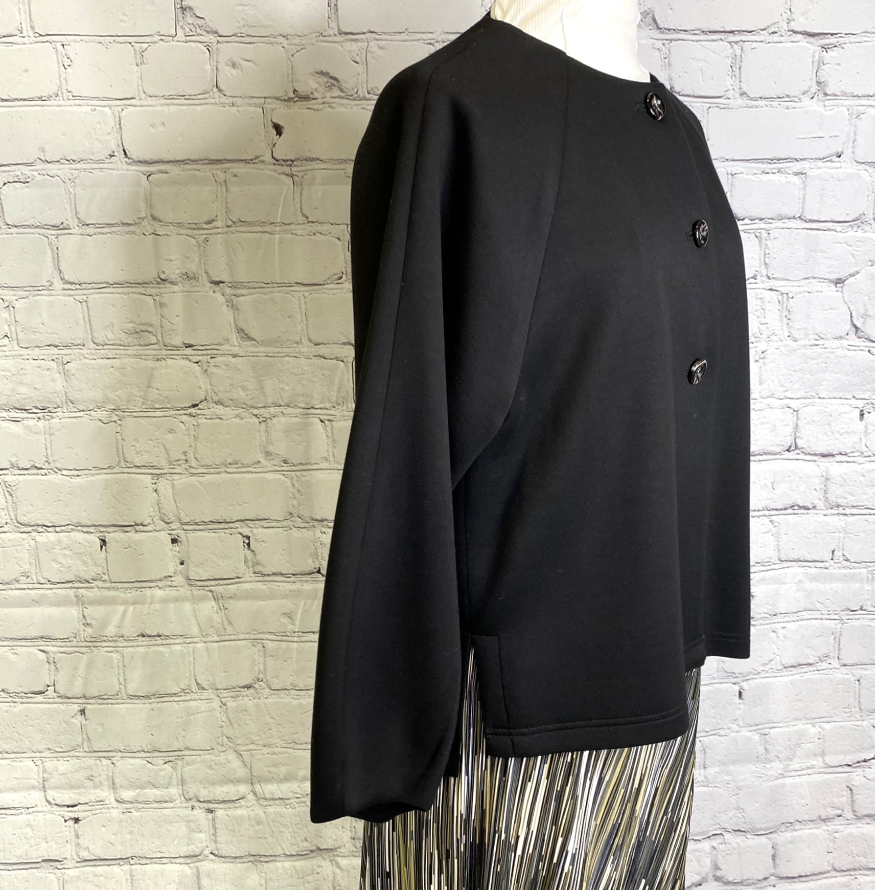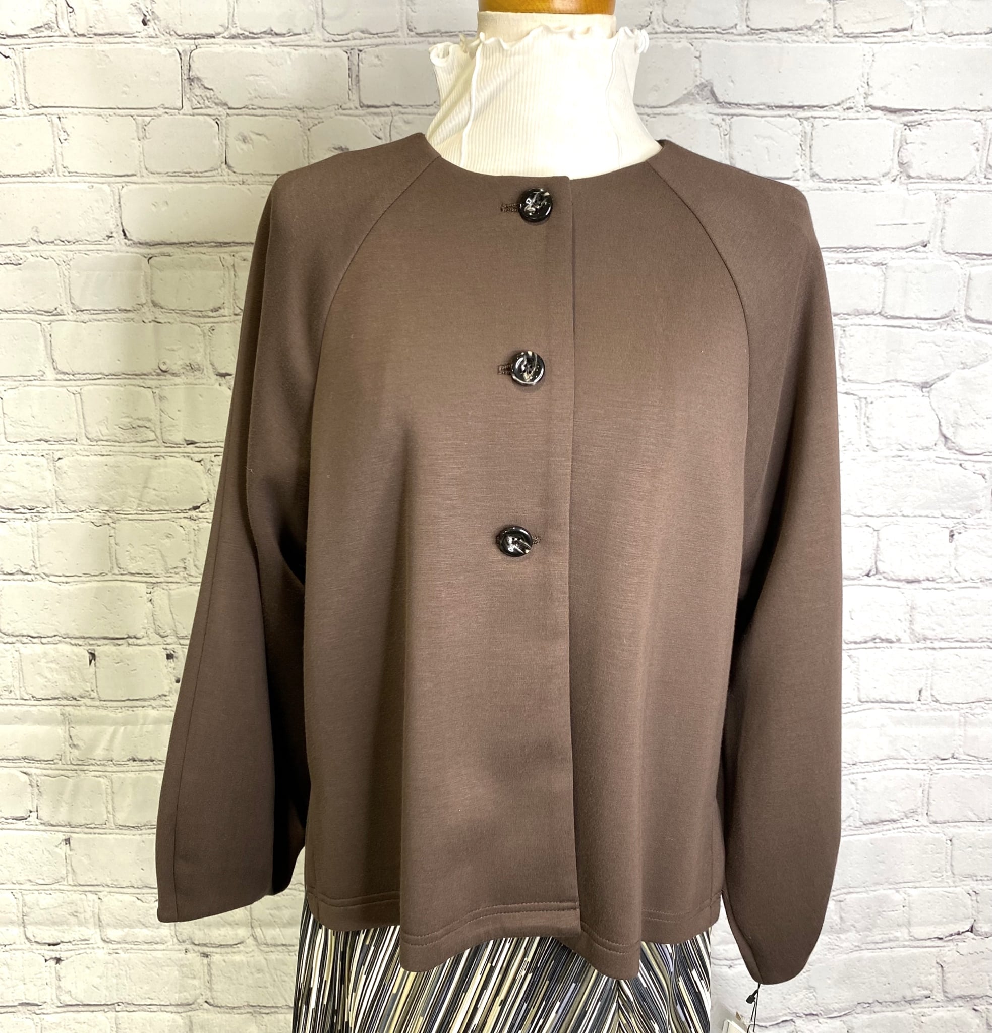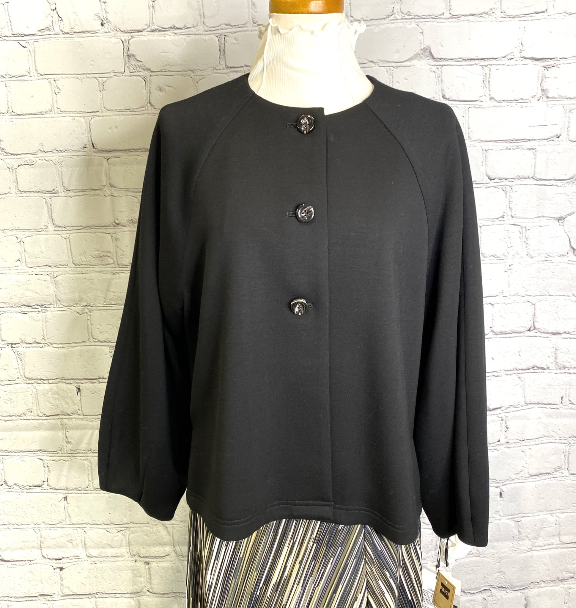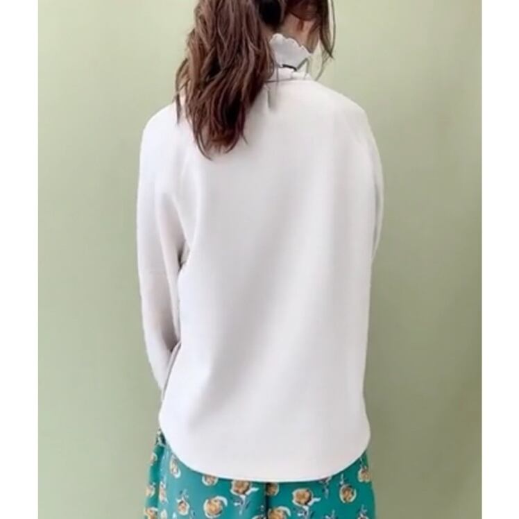 フロントの上から3ボタンがポイントのシンプルジャケットです。 ノーカラーなので人気のボトルネックのトップスを合わせたり首元のおしゃれも楽しめます。お袖がゆるめでシルエットが大人かわいい一枚です。
