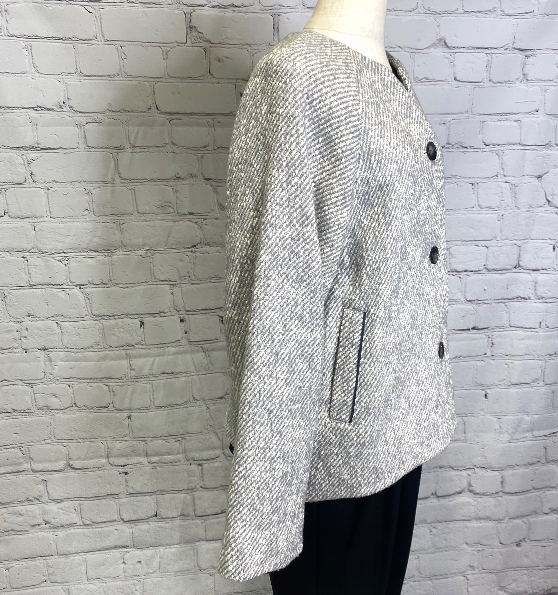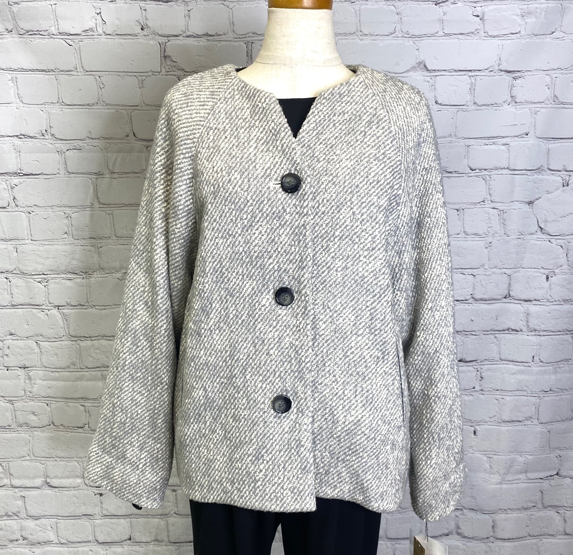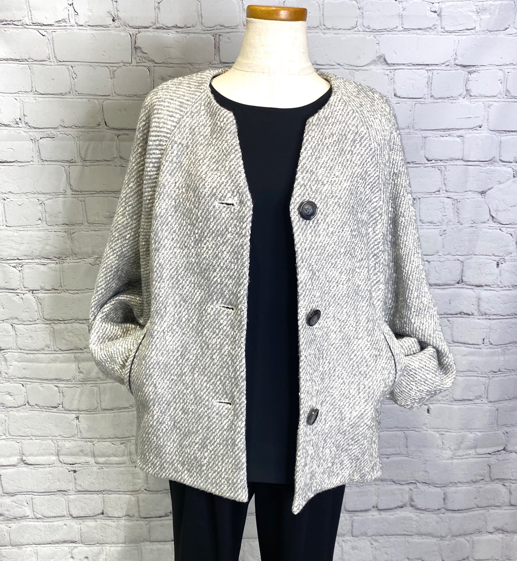 ネップが入った柔らかいツィード素材を使用したコートです。グレーは綾目、ネイビーはチェック柄になります。 すっきりしたキーネックで軽くてさっと羽織るのに便利なアウターです。ポケットあり。