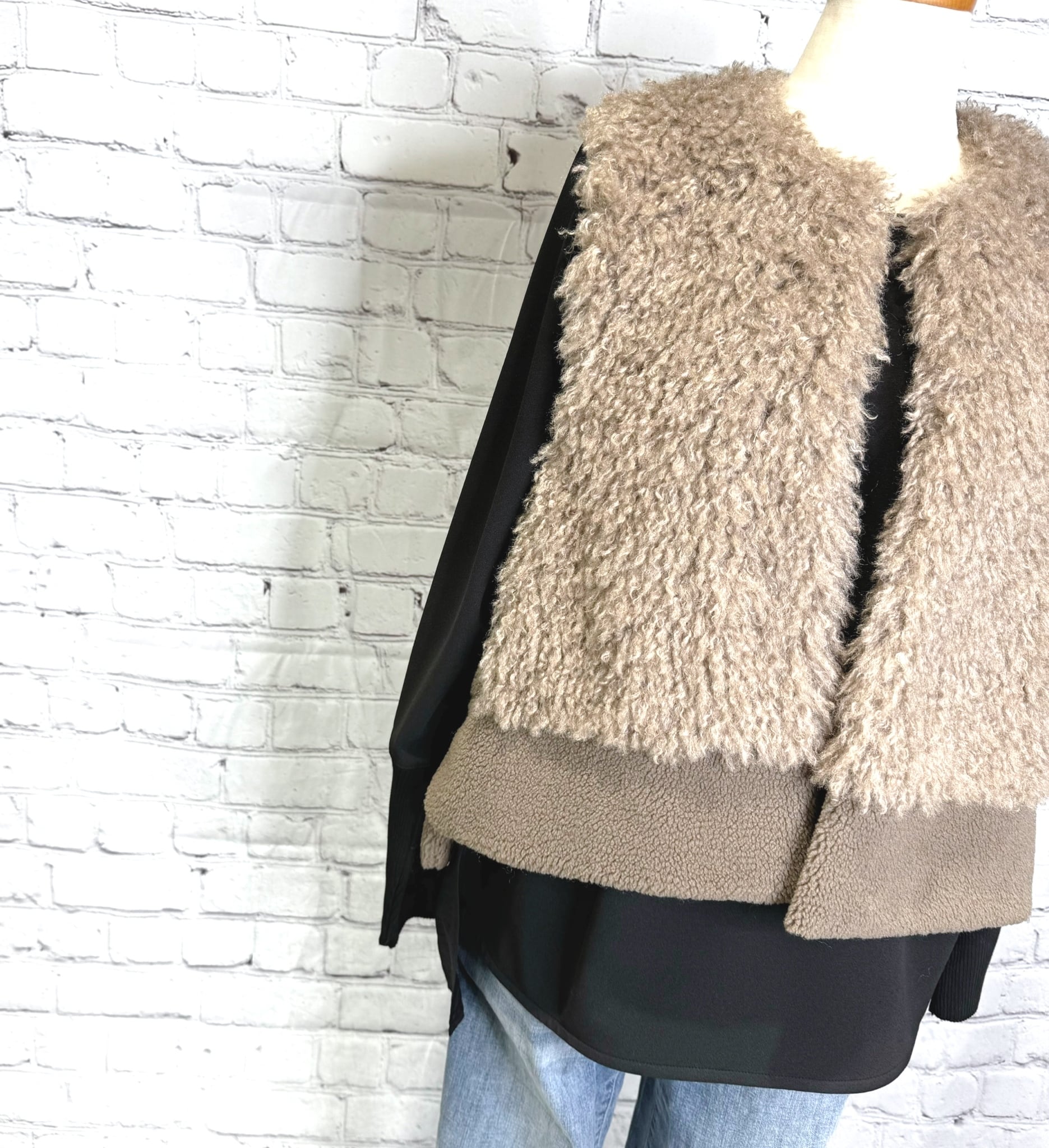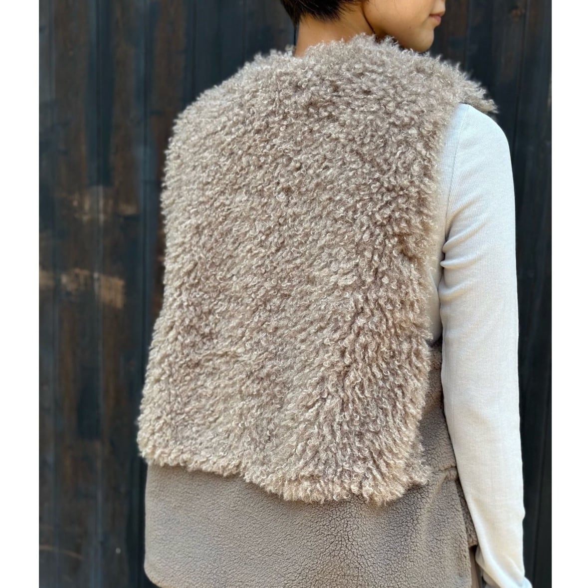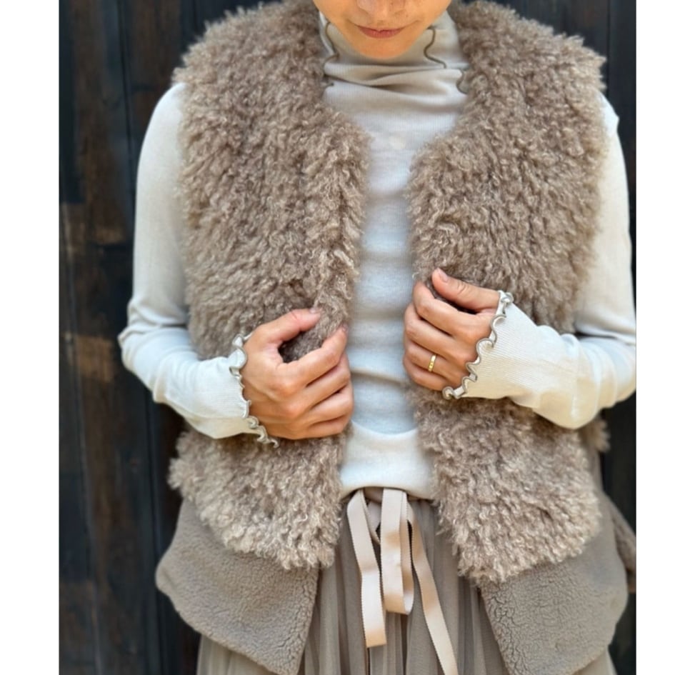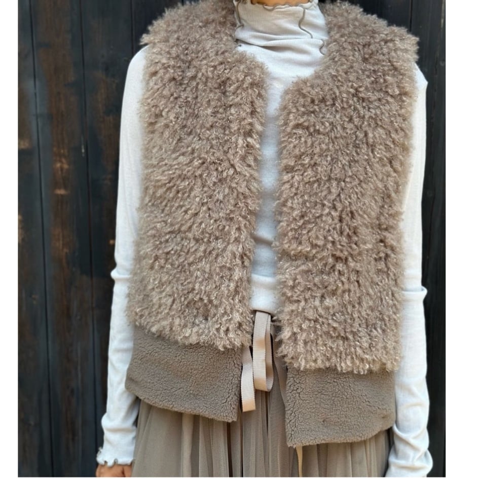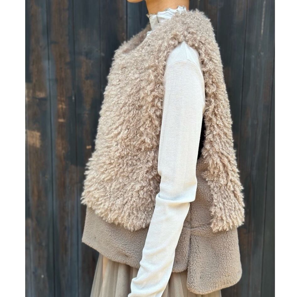 柔らかいカーリーヘアとボアの切替ベストです。とても軽くてアームが広めなので着心地が良く、インナー選ばずカジュアルからきれいめなど色々なコーデにマッチしてくれる優秀アイテムです。ワンピースコーデにプラスしても大人可愛い♡ フロント3箇所カギホックあり。