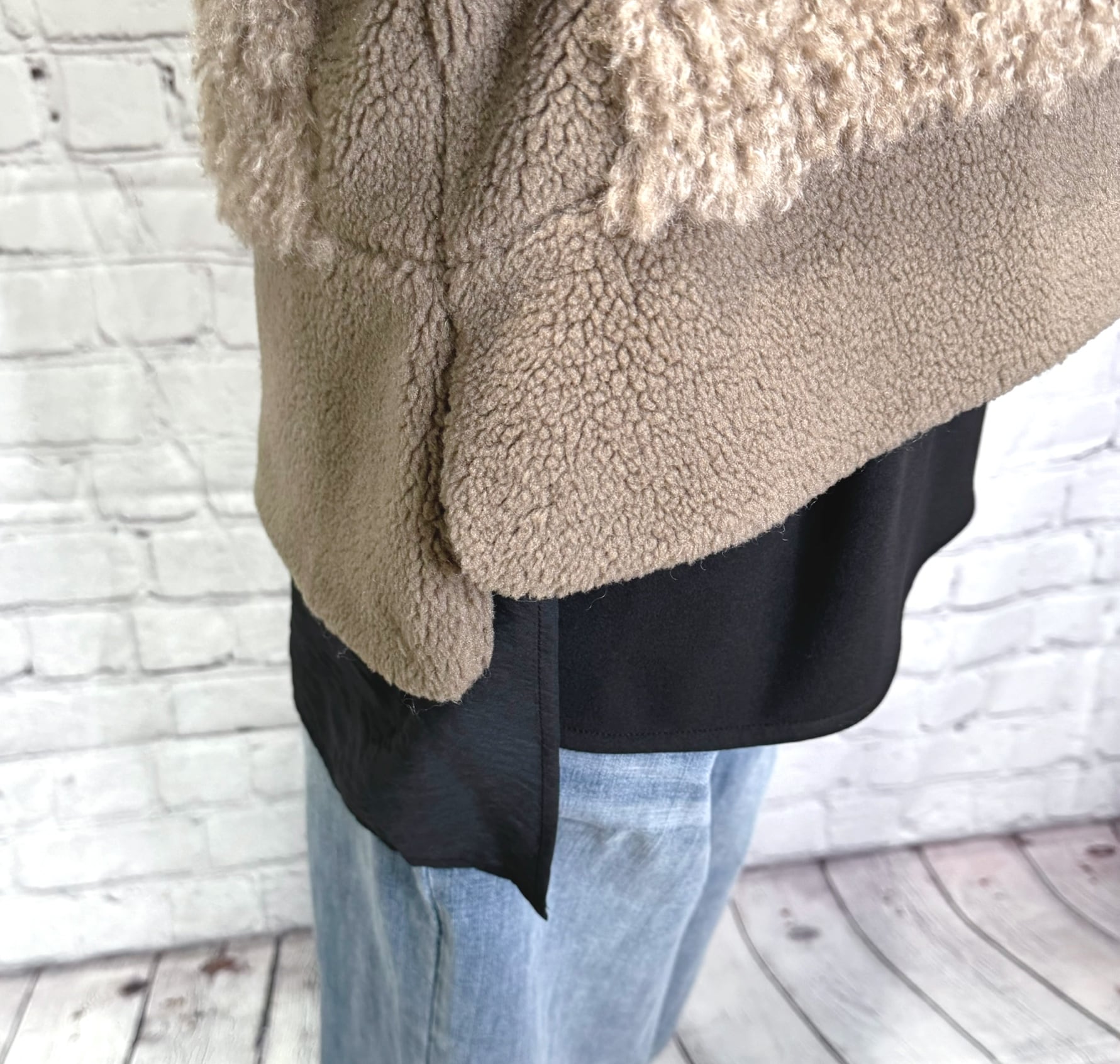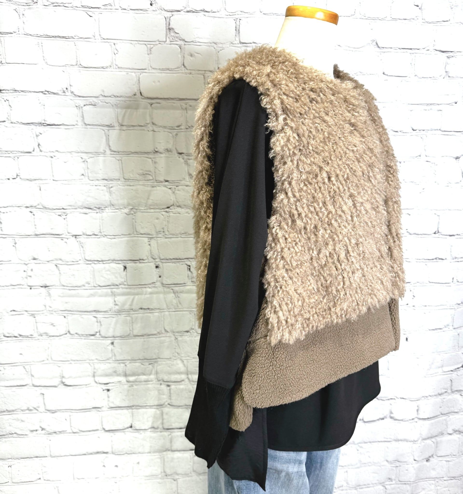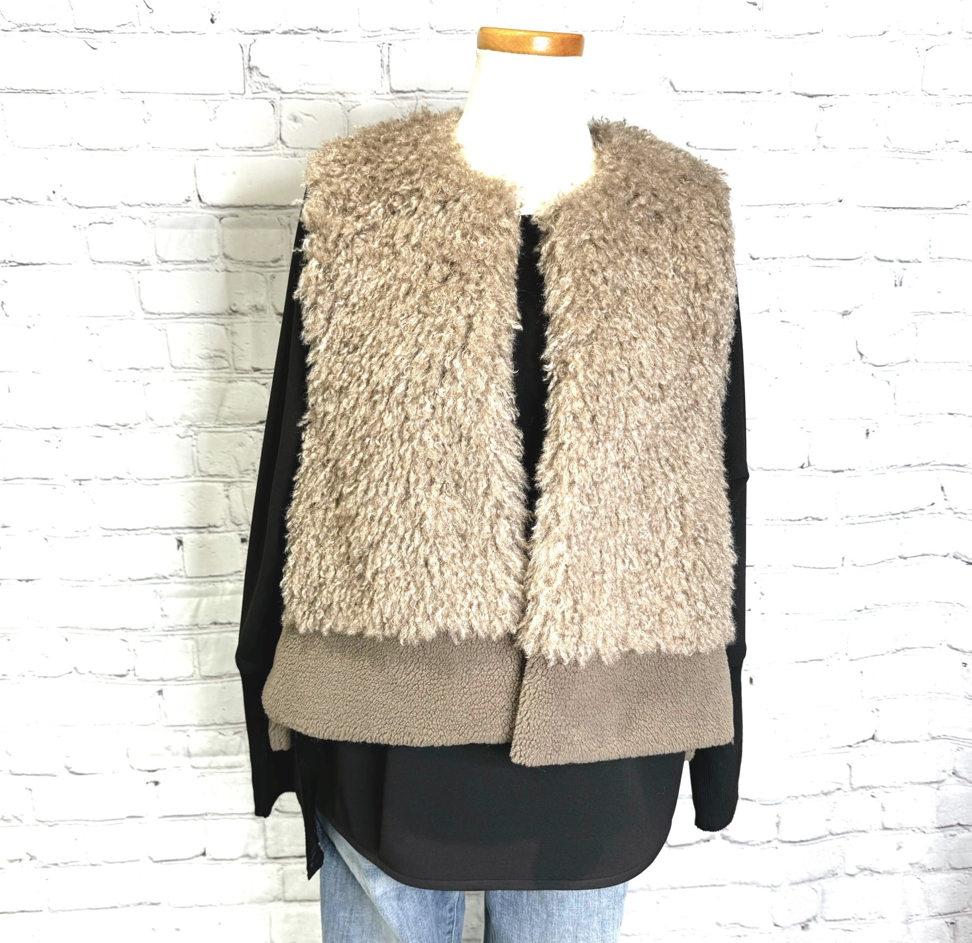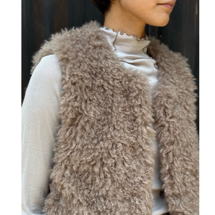 柔らかいカーリーヘアとボアの切替ベストです。とても軽くてアームが広めなので着心地が良く、インナー選ばずカジュアルからきれいめなど色々なコーデにマッチしてくれる優秀アイテムです。ワンピースコーデにプラスしても大人可愛い♡ フロント3箇所カギホックあり。