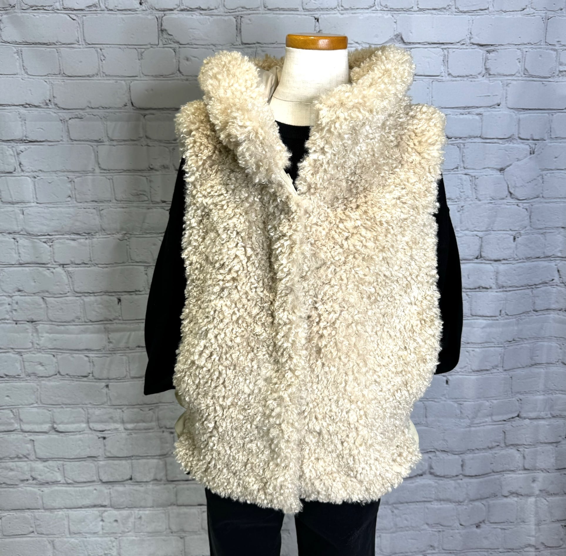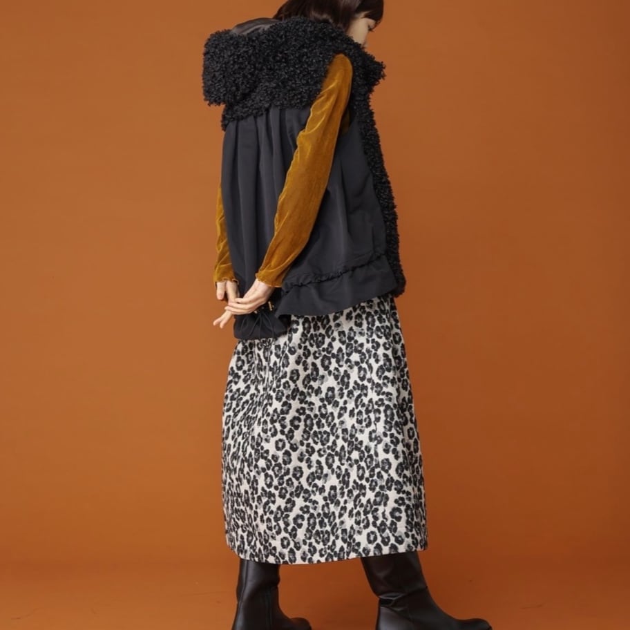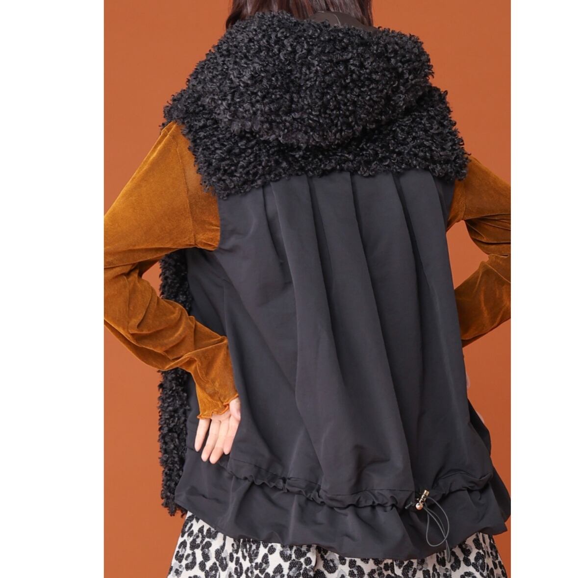 シープファーのような毛並みをカールさせたフェイクファーを使用したフードベストです! もこもこ感が可愛く、カジュアルにきまりがちなベストコーデもトレンド感のあるレディな仕上がりに。後ろタックと裾のドロストがバックスタイルにもふんわり感をプラスします。軽くて、大人可愛いデザインで、プラスワンで羽織るだけでコーディネートの主役に♡ ポケットあり。フード取り外し不可。