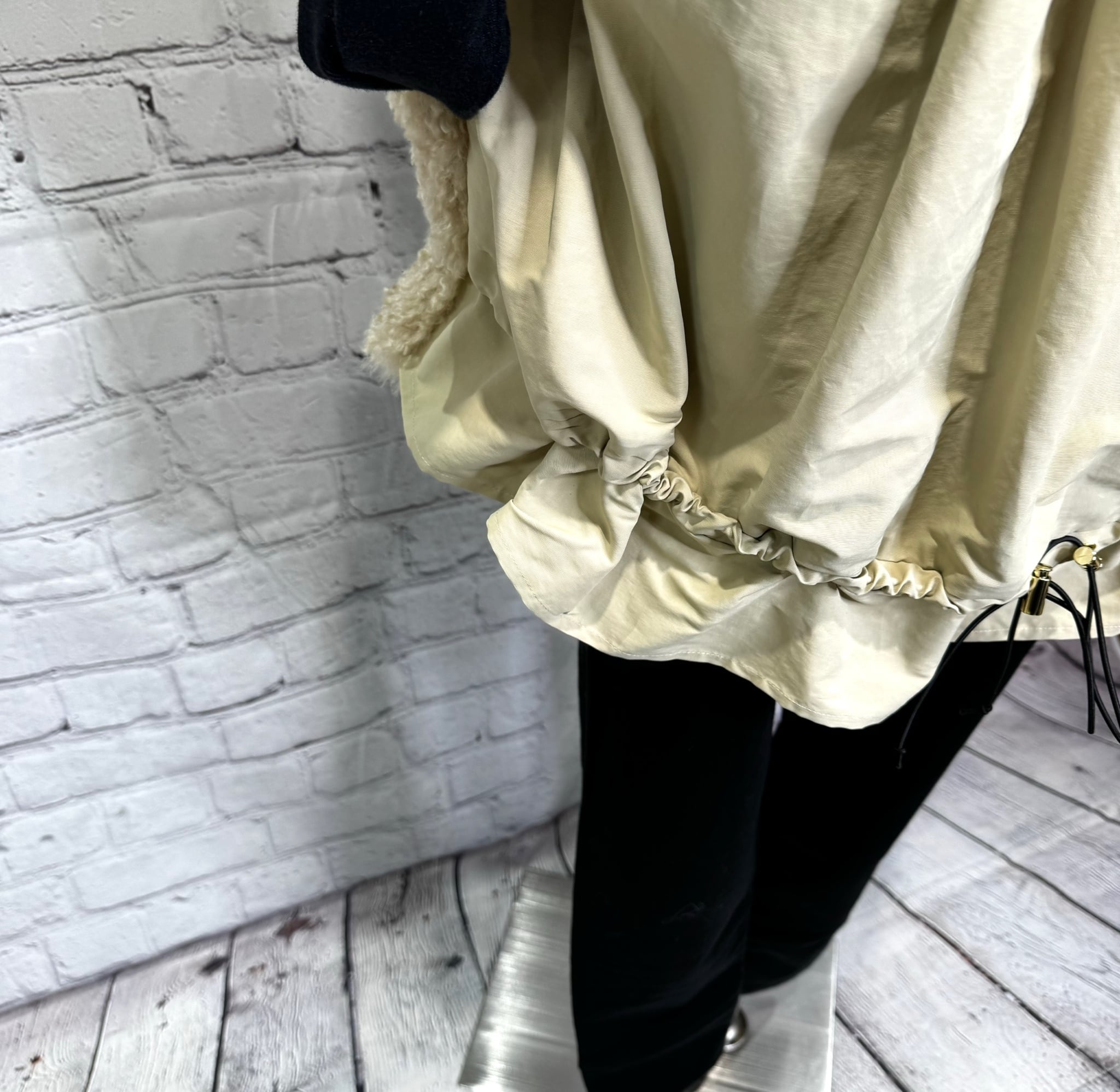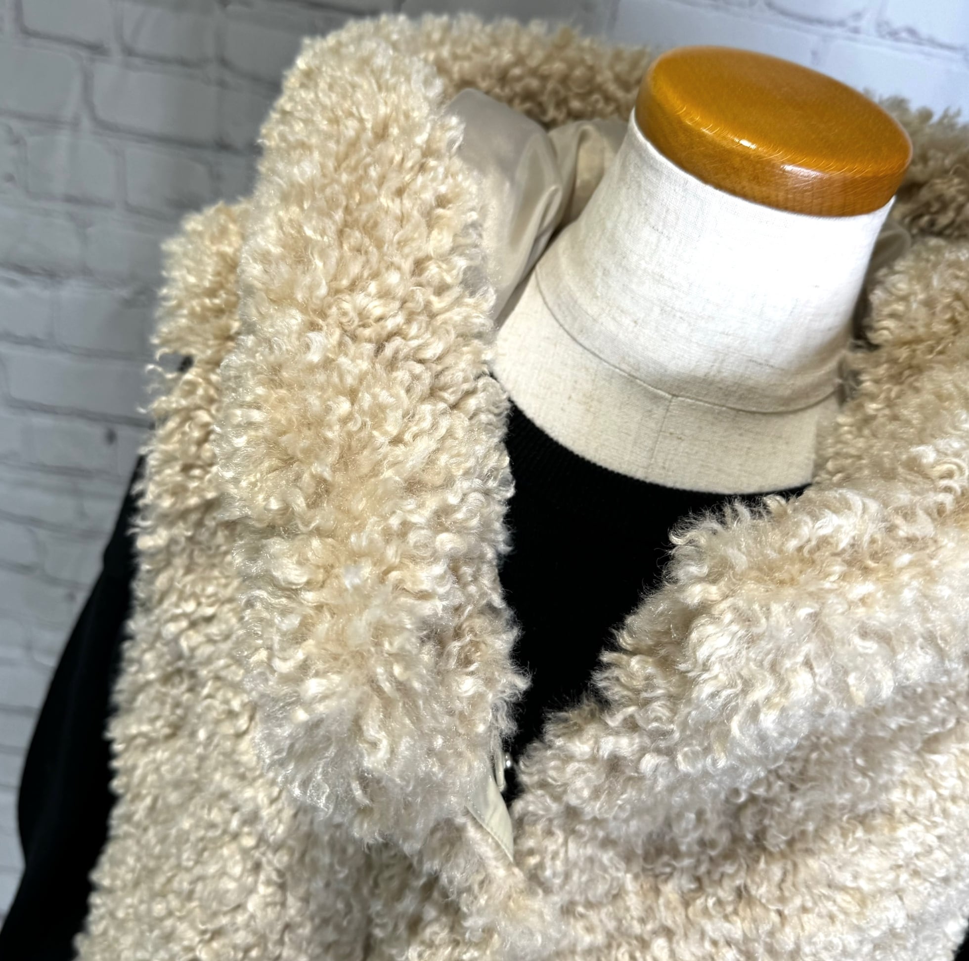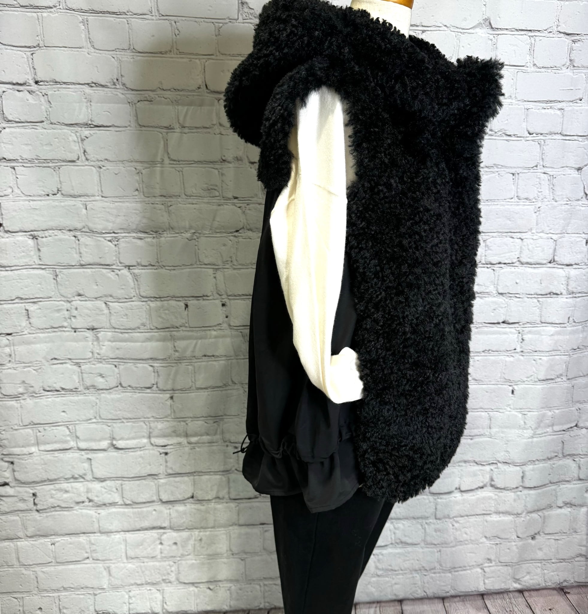 シープファーのような毛並みをカールさせたフェイクファーを使用したフードベストです! もこもこ感が可愛く、カジュアルにきまりがちなベストコーデもトレンド感のあるレディな仕上がりに。後ろタックと裾のドロストがバックスタイルにもふんわり感をプラスします。軽くて、大人可愛いデザインで、プラスワンで羽織るだけでコーディネートの主役に♡ ポケットあり。フード取り外し不可。