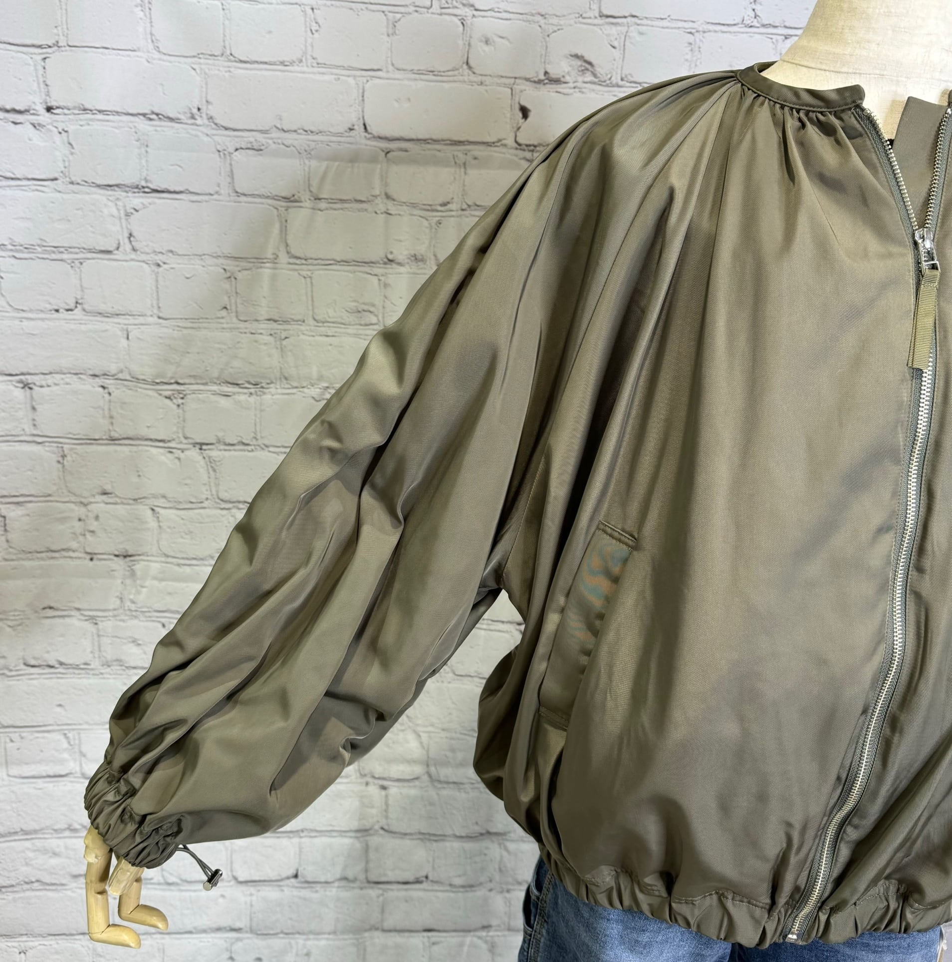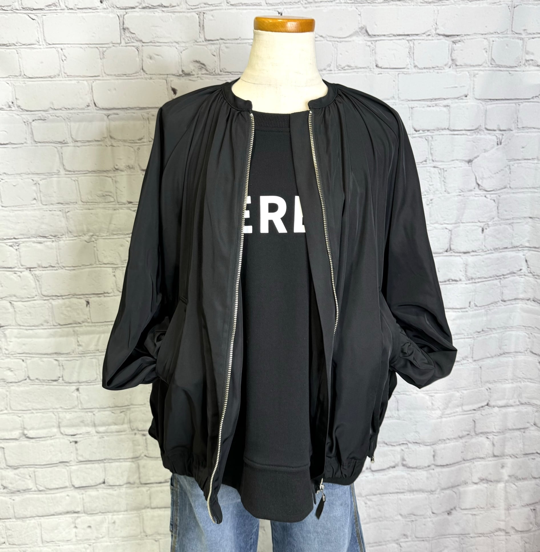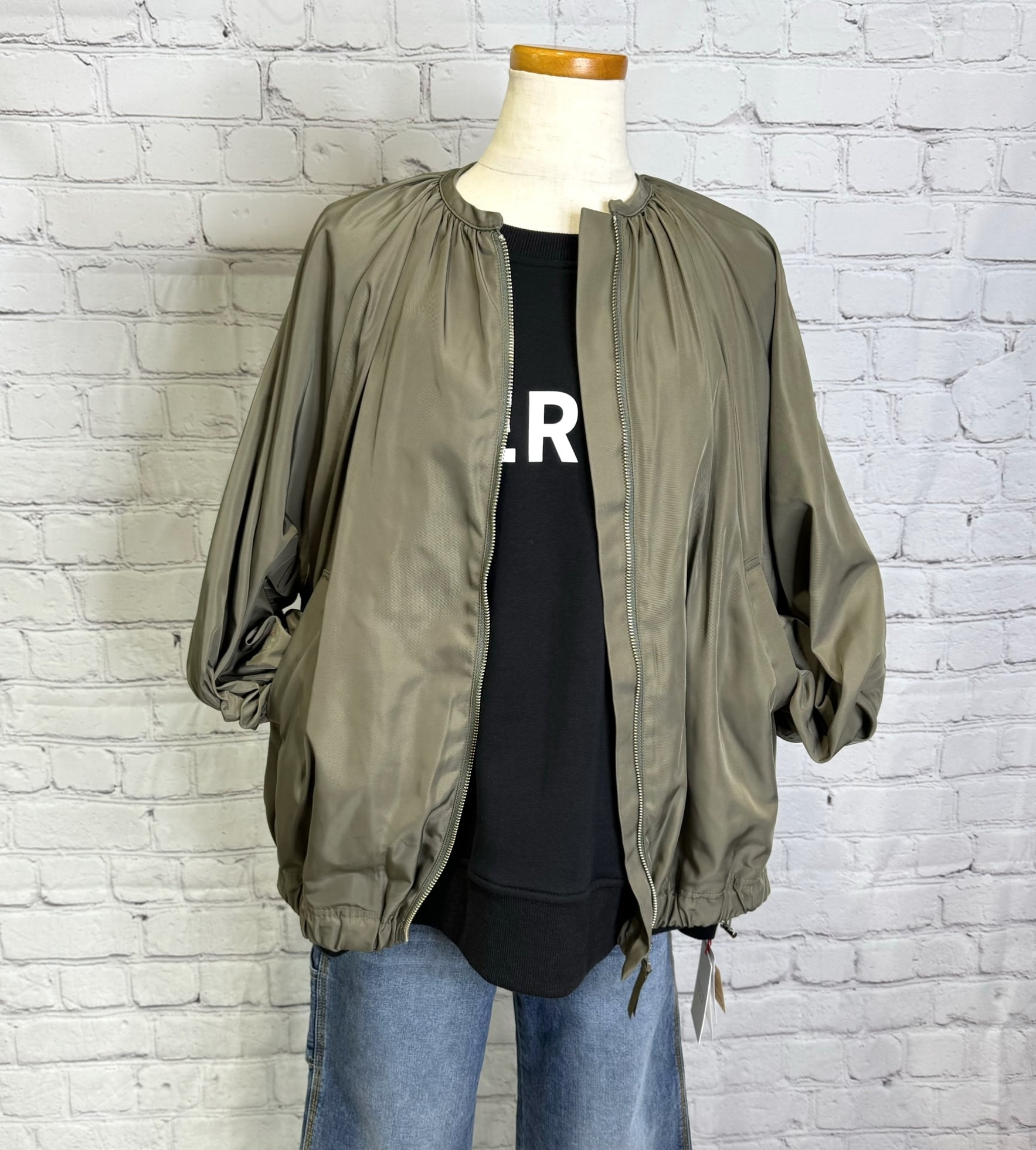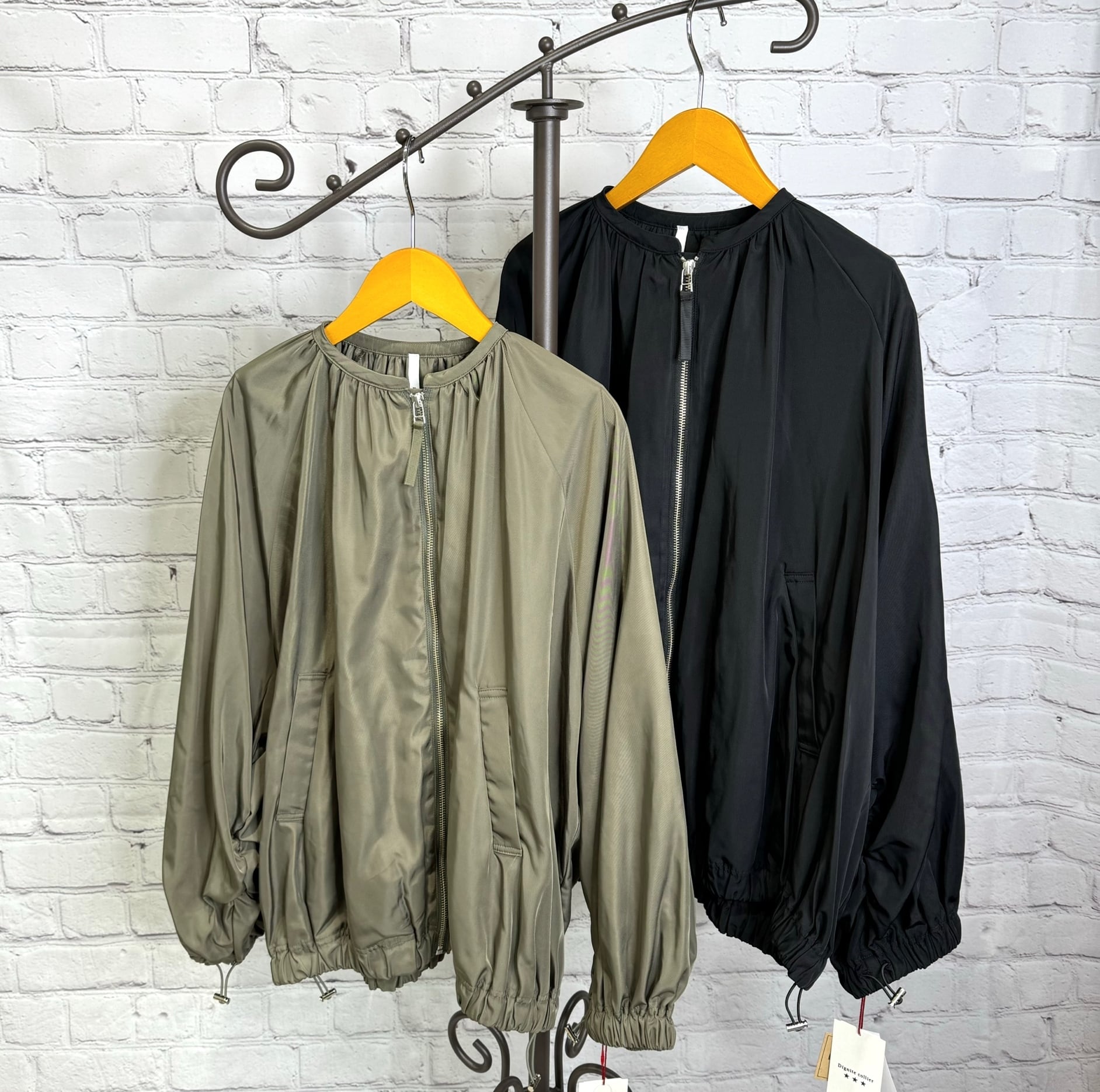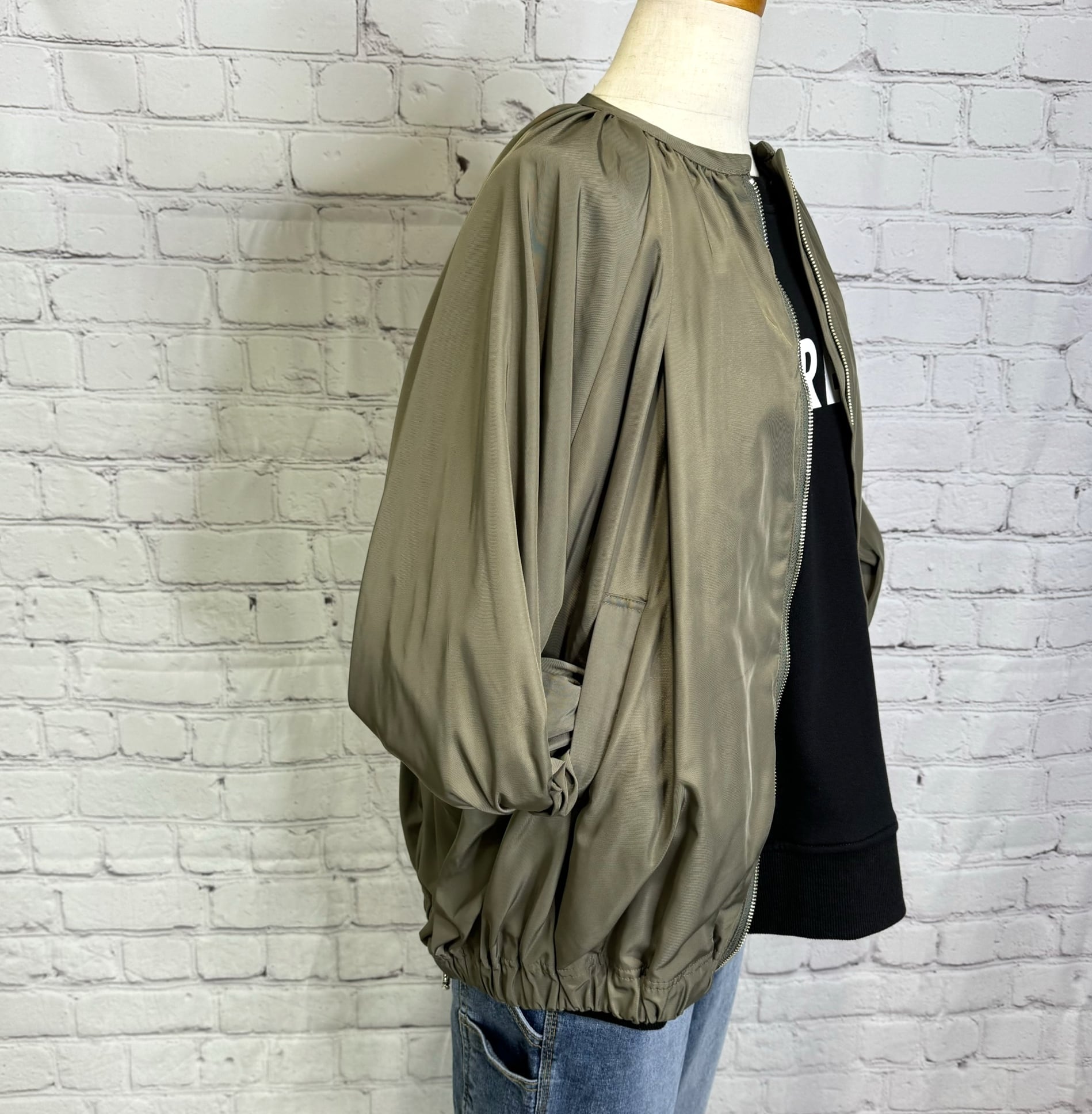 ゆるシルエットのブルゾンです。袖口と裾のドロストでシルエットを変えられます。ノーカラーなのでカジュアルに見えがちなブルゾンに女性らしさをプラスした大人可愛さもプラス♡ ゆるシルエットなのでオーバーサイズのトップスとの相性も良く、程よい丈感でパンツでもスカートでもボトムス選ばずコーデしやすいおすすめアイテムです。ポケットあり。
