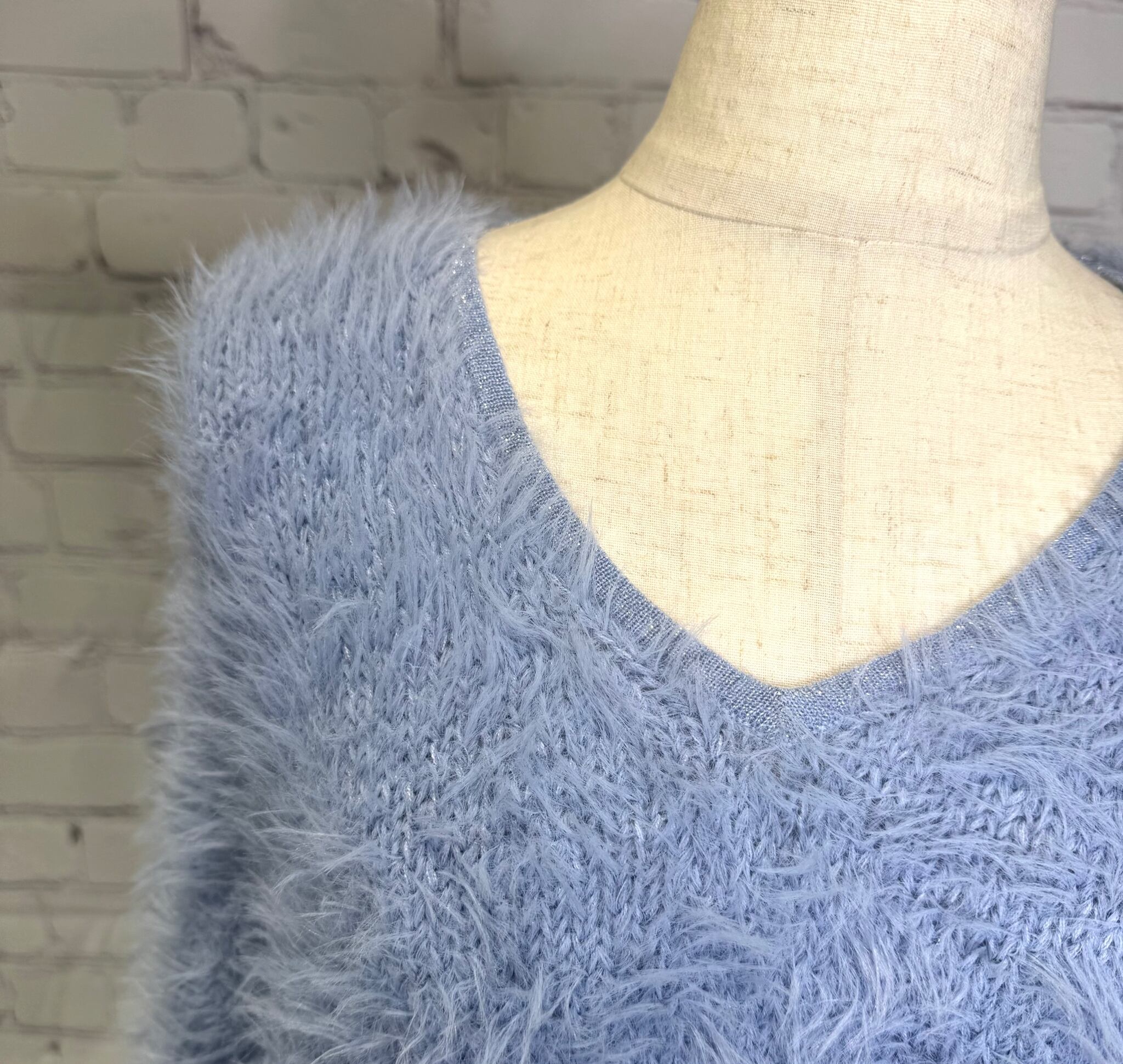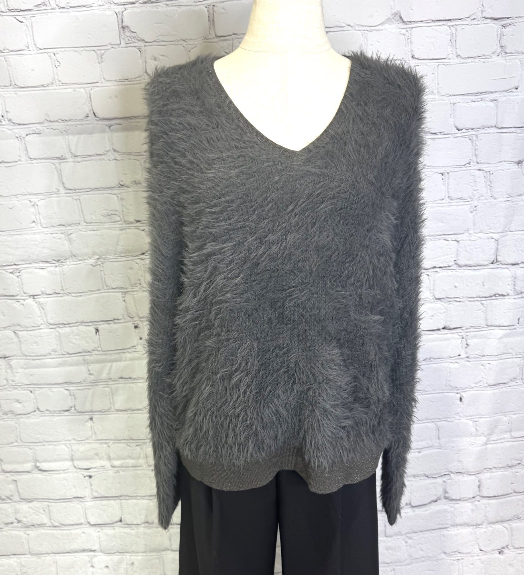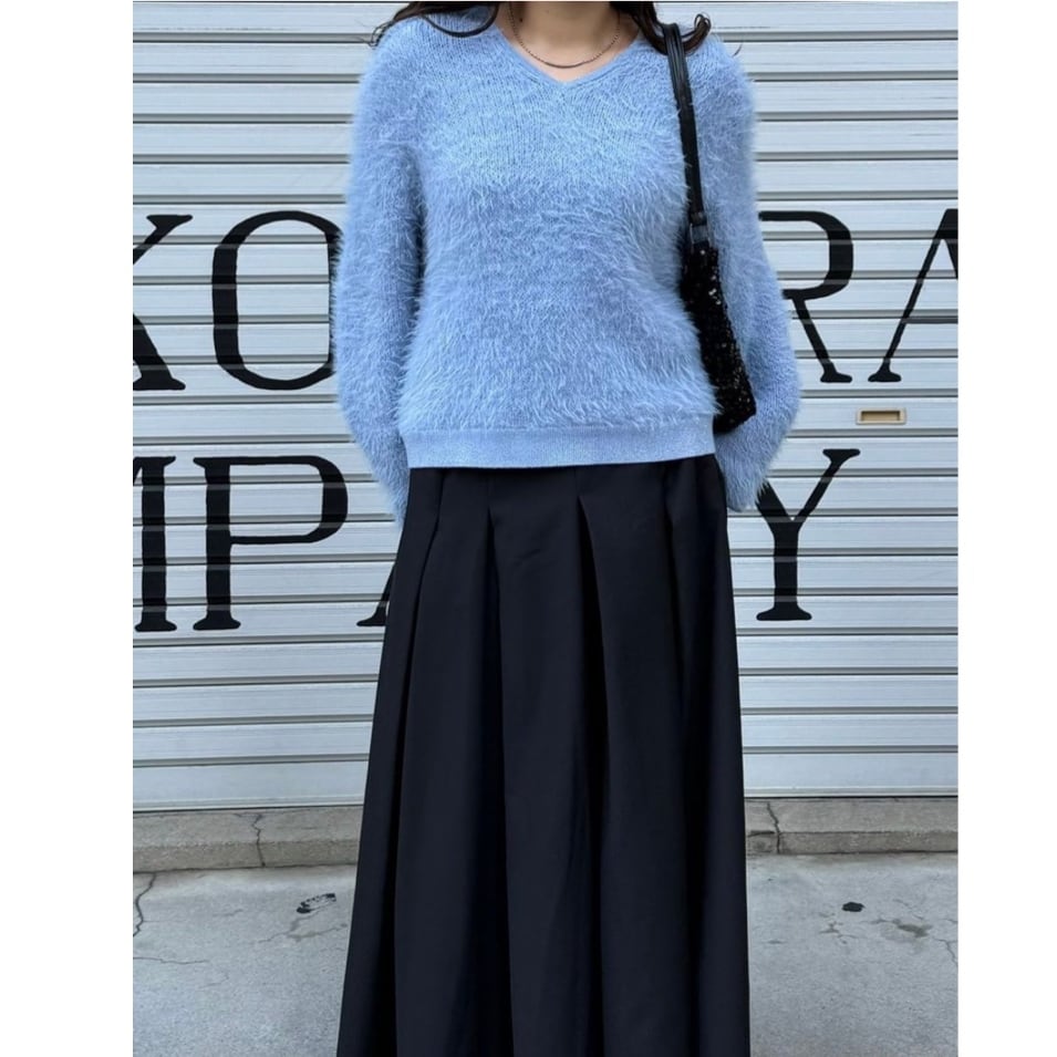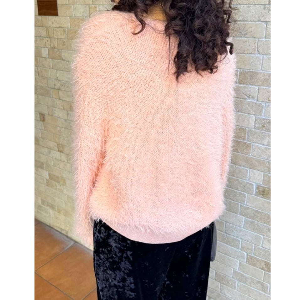 首元がすっきりきれい見えしてくれる Vネックのシャギーニットです。衿と袖口、裾はラメ仕様になっていて女性らしさと上品さをプラス♡ シンプルなデザインながらふわふわシャギーで華やかなコーデをお楽しみいただけます。程よい丈感でボトムス選ばずパンツでもスカートでもコーデしやすくておすすめです。 お家で洗えます。