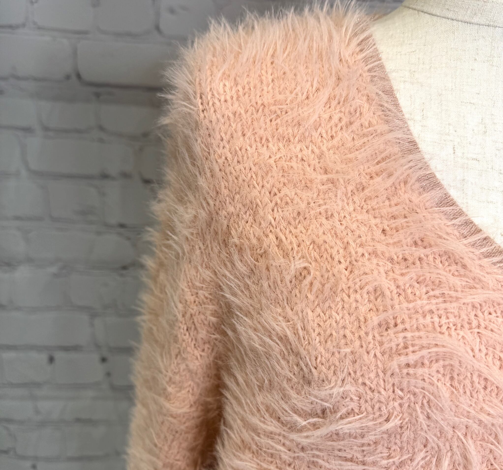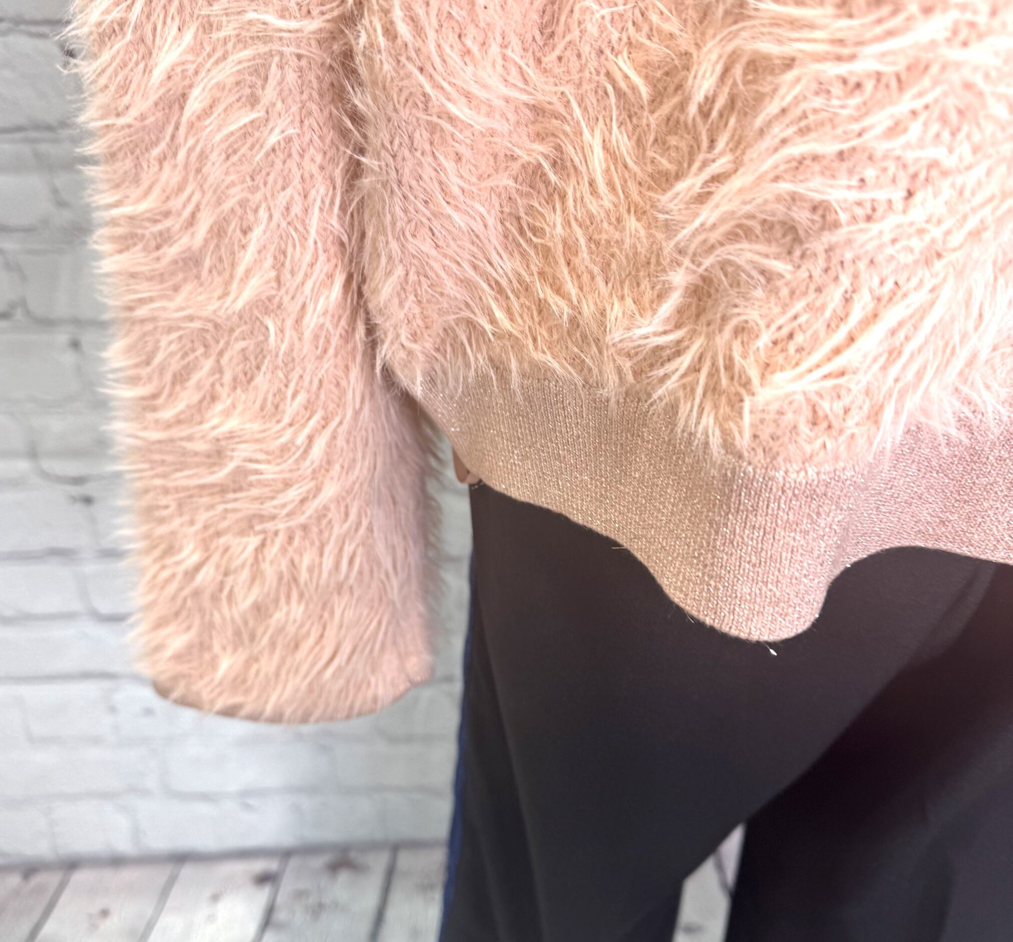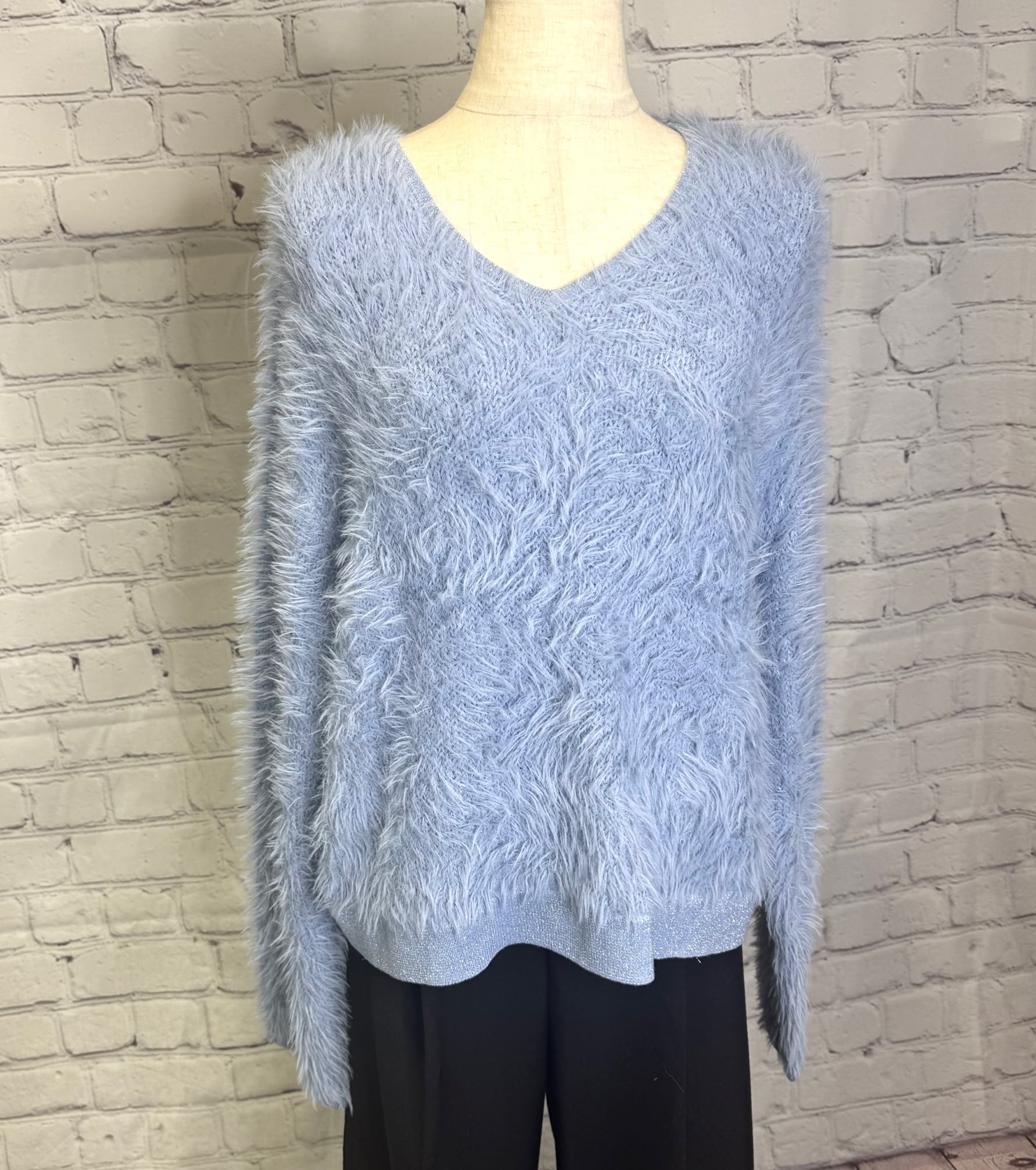 首元がすっきりきれい見えしてくれる Vネックのシャギーニットです。衿と袖口、裾はラメ仕様になっていて女性らしさと上品さをプラス♡ シンプルなデザインながらふわふわシャギーで華やかなコーデをお楽しみいただけます。程よい丈感でボトムス選ばずパンツでもスカートでもコーデしやすくておすすめです。 お家で洗えます。