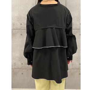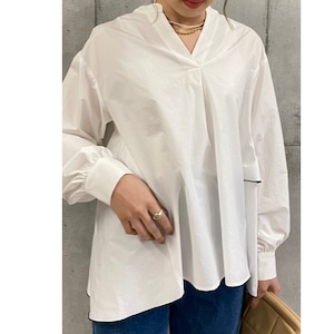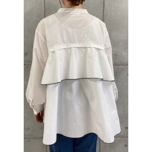 バックデザインに配色のメロウ始末を施したフレアがポイントになった大人可愛いブラウスです。ポリエステル100%のシワも気になりにくい素材でストレッチ性もあって着心地◎ 首元もスキッパーなので、タートルネックのインナーやシアーインナーを合わせて早い時期から着ていただけるアイテムです。お家で洗えます。